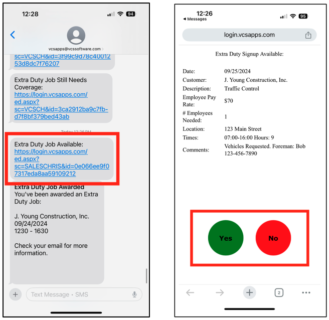 - You can view the details of the job, including date, payrate, and location, on the Extra Duty Signup Available screen. Click Yes to sign up for the job, or No to reject the job.